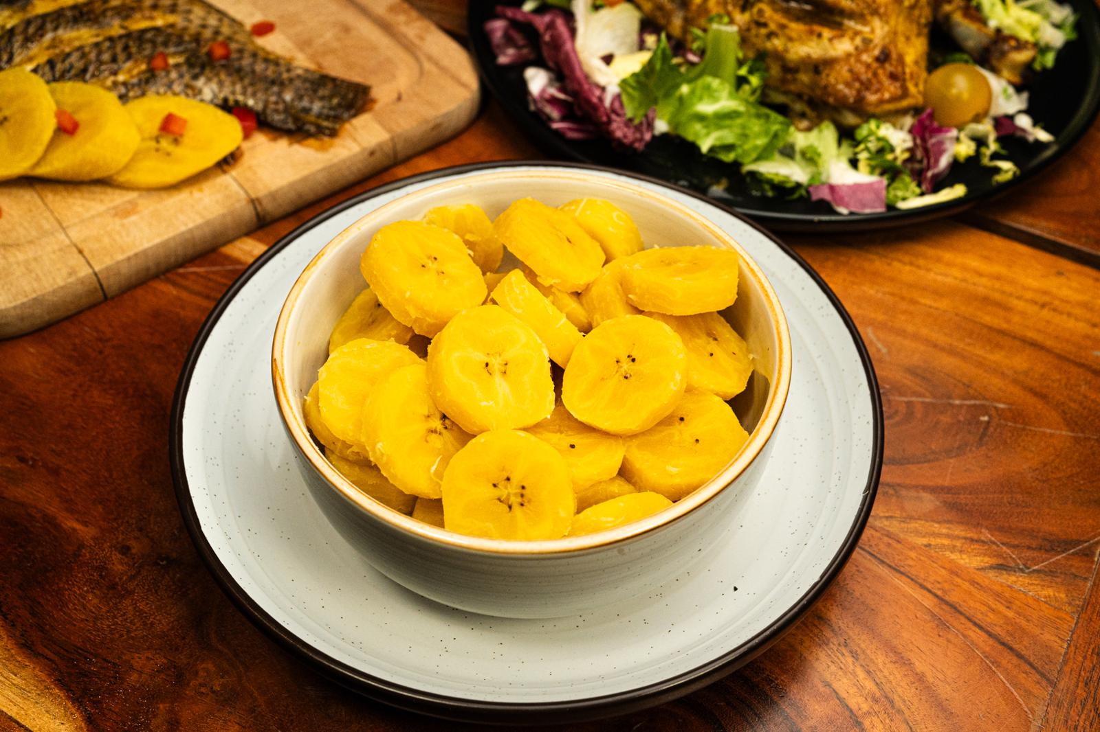 Banane plantain mûre coupée en rondelles et frite à l’huile ; dorée et fondante.