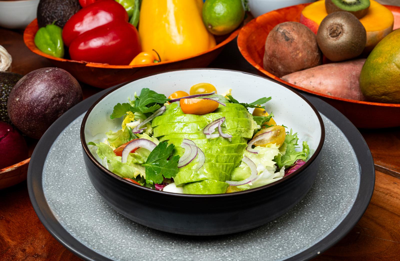 Mélange de salades, avocat et mangue en dés, tomates cerises, trois crevettes rôties, accompagnées d’une sauce maison dans un fruit de la passion.